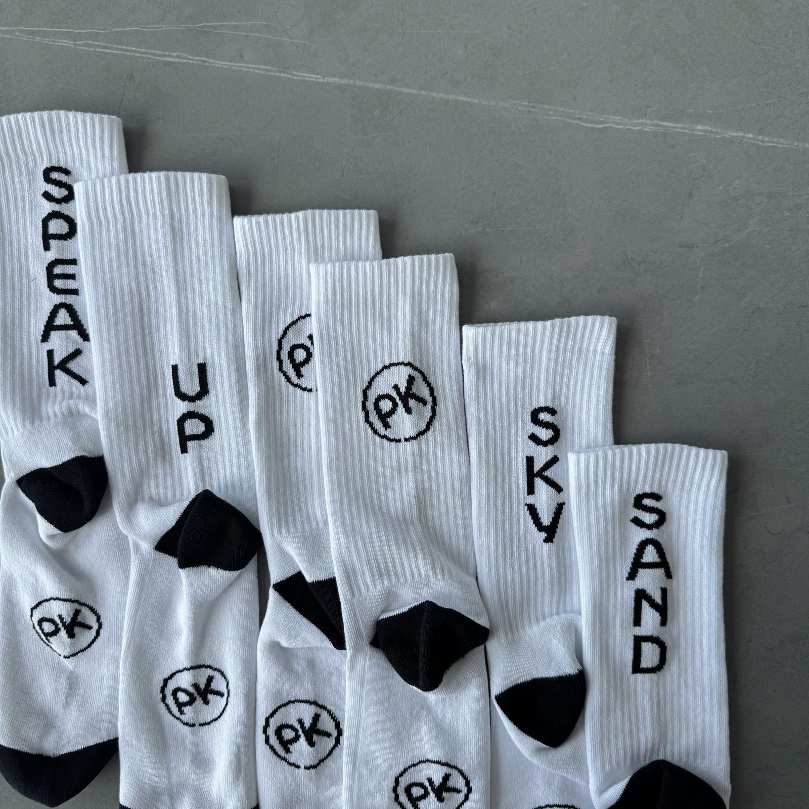 Weiße Socken in 3 verschiedenen Motiven: PK, SKY SAND oder SPEAK UP